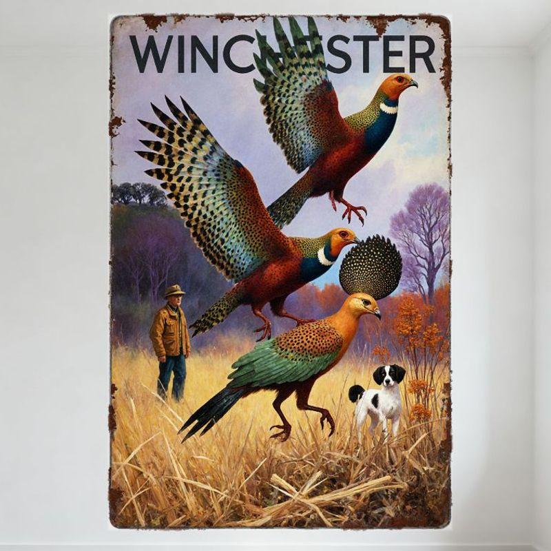 Vintage Winchester Metal Tin Sign, Rustic Pheasant Hunting Scene with Man & Dog, Retro Country Home Decor for Man Cave Cafe Bar