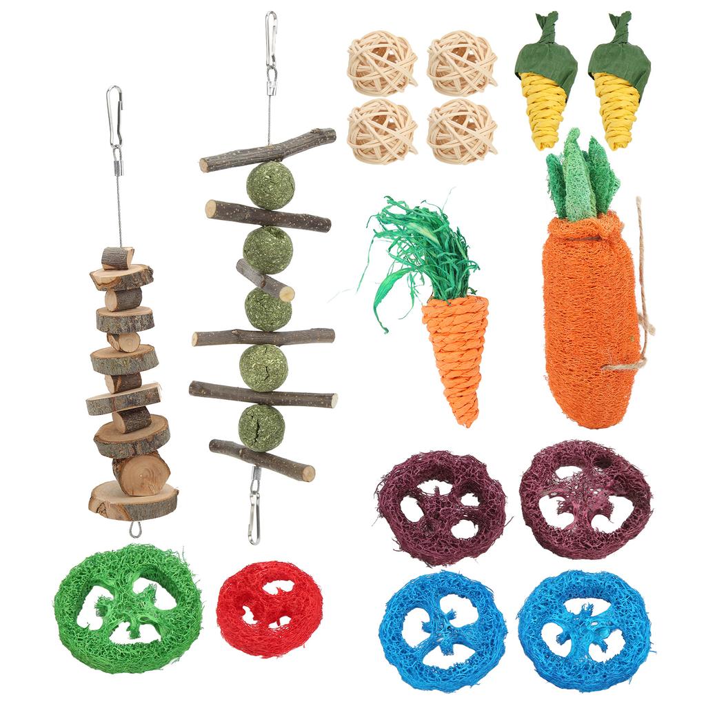 1 x Grass Ball String4 x Rattan Ball6 x Loofah Tablets1 x Wood Chip String1 x Woven Carrot1 x Loofah Carrot2 x Woven Corn