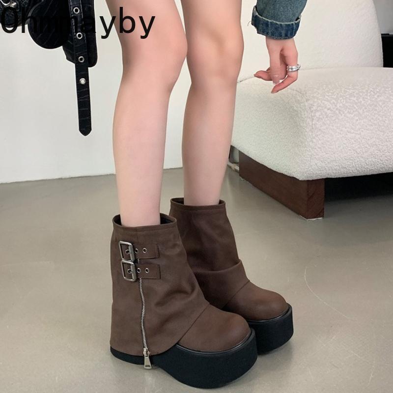 Thick Bottom Women Ankle Boots Designer Belt Buckle Platform Heel Shoes Autumn Winter Modern Short Booties