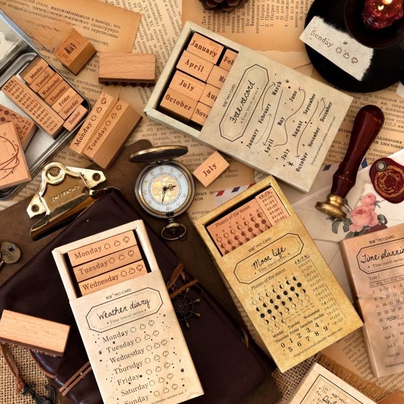 1/7/10/12/13pcs Wooden Seal Set Time Travel Series Clear Patterns for DIY Handbook Decoration Travel Record Schedule Management