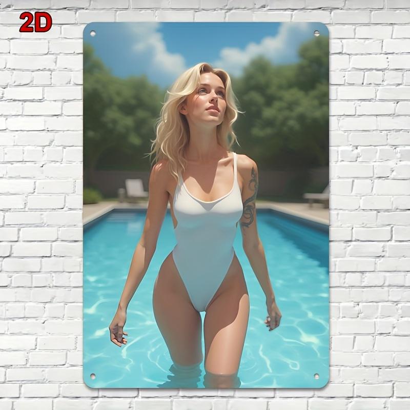 Retro Metal Tin Sign 8x12 Inch Vintage Wall Art, Bikini Girl Poolside Iron Poster For Bar Cafe Bedroom Decor