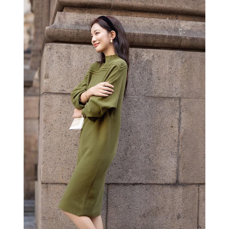 Demana Women's Winter Elegant Half-High Collar Knit Midi Dress