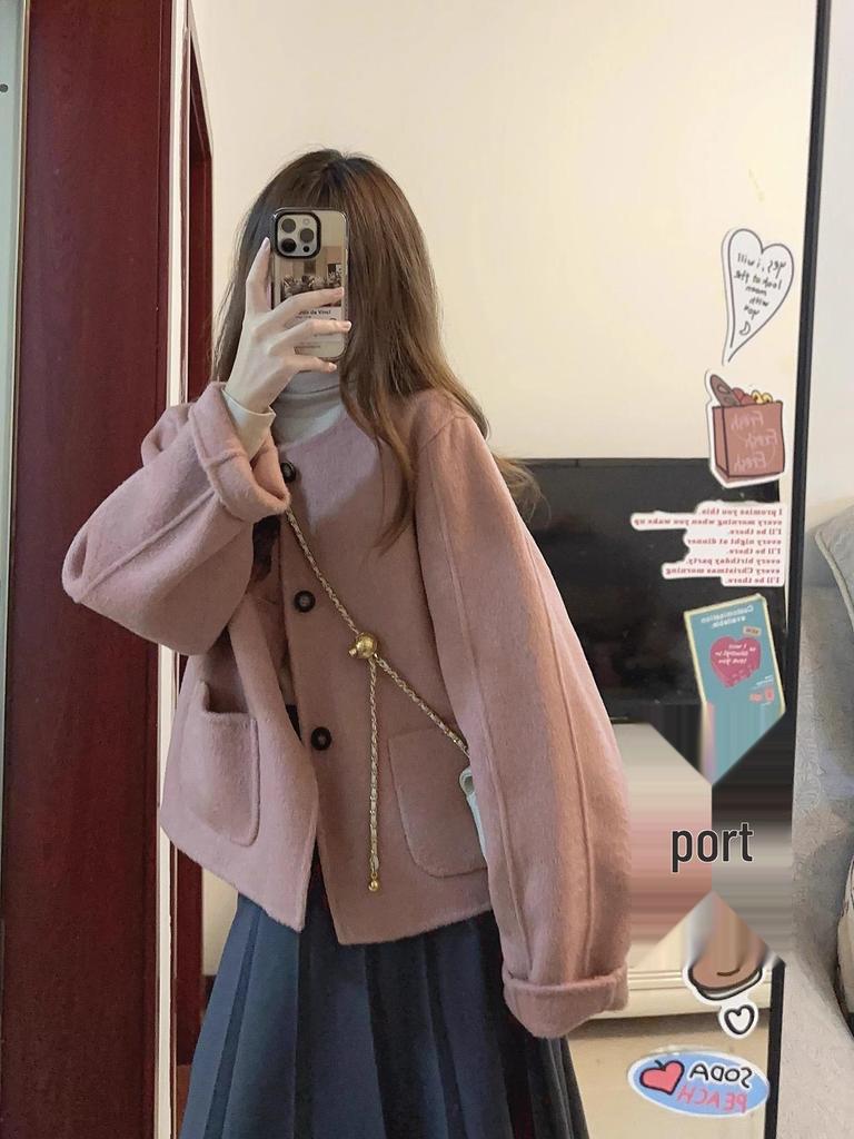 Elevate your autumn and winter wardrobe with this trendy Korean-style petite women's short wool coat. Crafted from high-quality polyester, this coat promises both warmth and style. Its solid pattern adds a touch of sophistication, while the medium outerwear thickness ensures comfort during cooler months. Featuring a round neckline and long sleeves, this coat is designed for the modern woman who values both elegance and coziness. Perfect for any occasion, it effortlessly combines practicality with contemporary fashion trends.