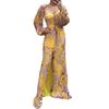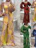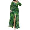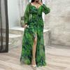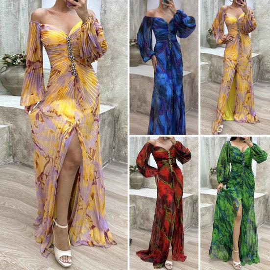Women Evening Dress Off Shoulder Rhinestone Decor Pleated Long Lantern Sleeve Split