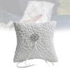 Hand beads organza rings pillow features delicate lace appliques and bowknot accent, embodying Western wedding with its soft craftsmanships.