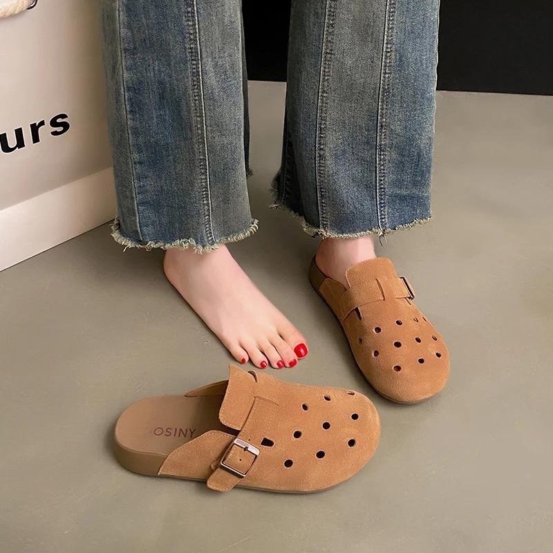 Fashion Ladies Shoes 2025 Closed Toe Women's Slippers Retro Casual Slippers Women Round Toe Buckle Hollow Flat with Plus Size Sandals