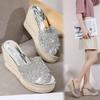 Fashion Slope Heel Cool Slippers 2024 Summer Water Diamond Sequin Decoration Flower Transparent Thick Sole Straight Drag Women's Shoes