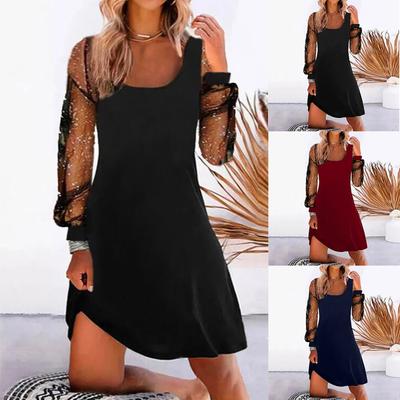 Ladies Sexy Fashion Solid Color Square Neck Splicing Mesh Long Sleeve Dress