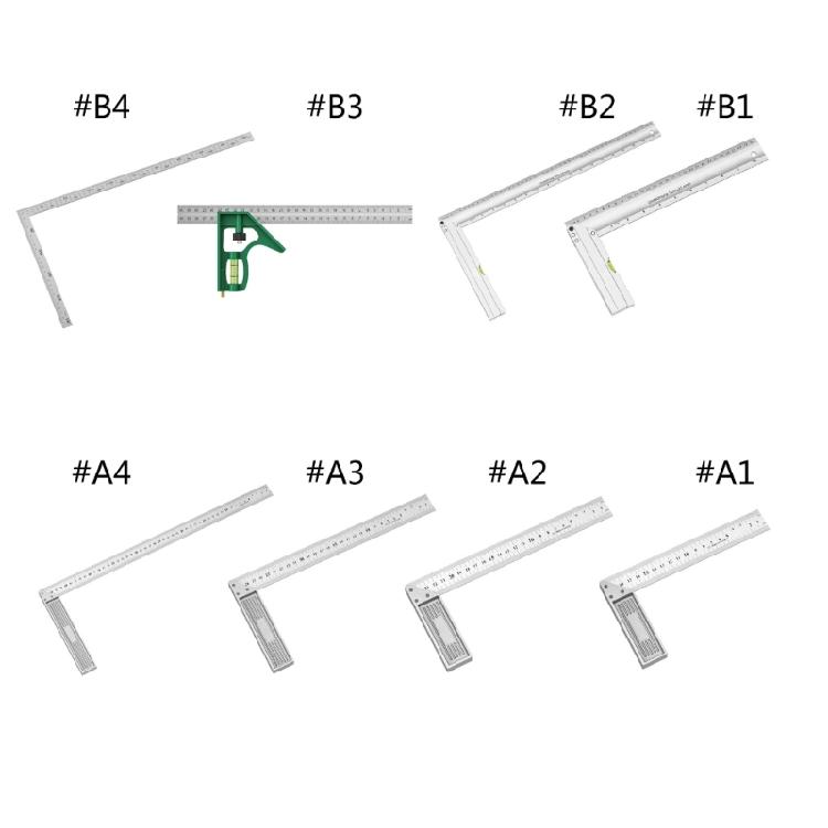 Çok fonksiyonlu kombinasyon açılı cetvel: 90° açı ölçümü, dik açılar ölçümü, 45° açı ölçümü, 90° açı işareti, 45° açı işareti, yatay ölçüm, dikey ölçüm, derinlik ölçümü.