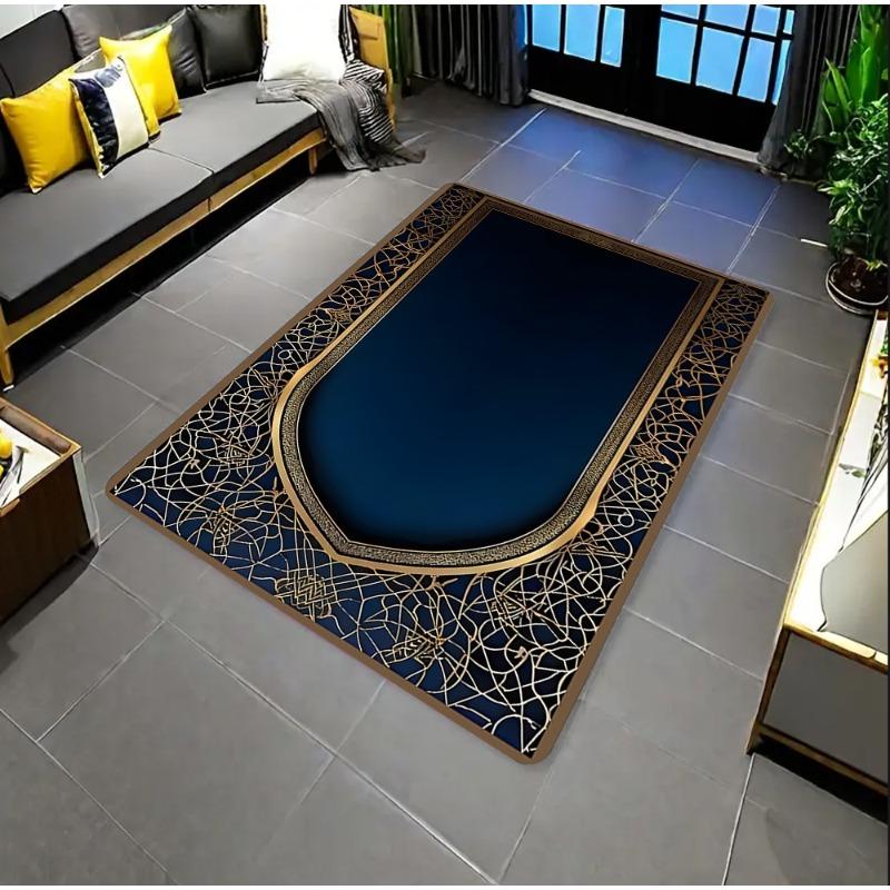 Islamic Geometric Border Rug - Navy Blue with Gold Ornate Motif Non-Slip Large Area Mat for Luxe Cultural Decoration Fashion