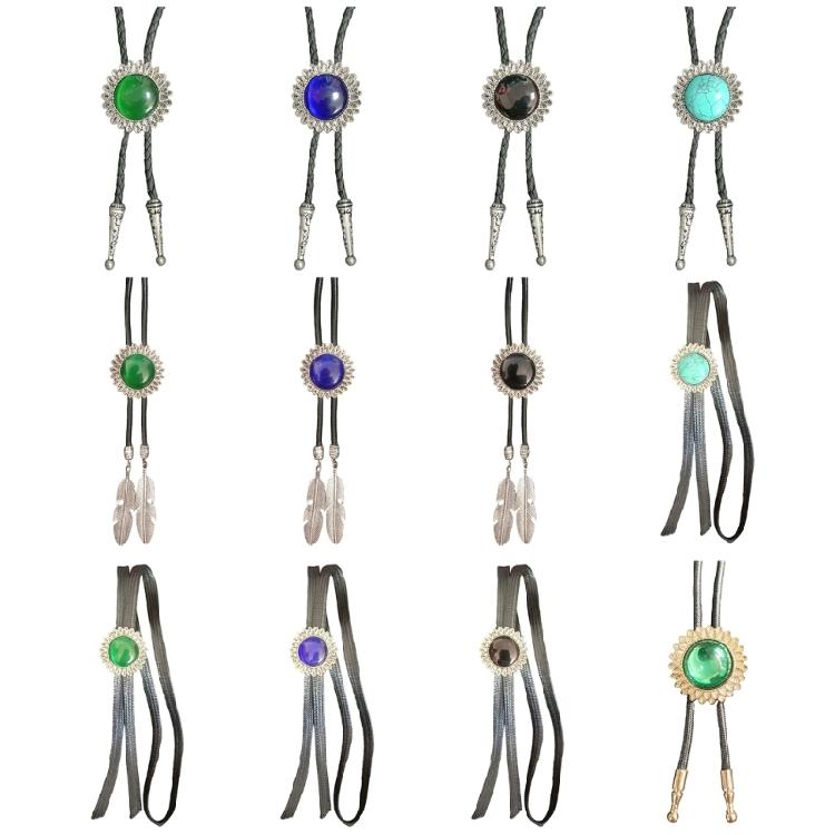 Braided Shoestring Flower Stone Bolo Tie Carved Charm Cowboy Necktie Necklace