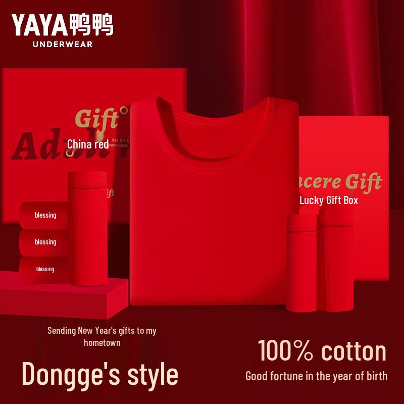 Stay warm and embrace the festive spirit with the Duck Duck Festive Red Cotton Thermal Underwear Set. Made from 100% pure cotton, this non-fleece lined, round-neck set offers comfortable warmth for temperatures between 0°C and 15°C. Designed with an anti-pilling finish and a casual, simple style, it's a popular choice for its comfort and auspicious red color. Each set is elegantly presented in a gift box, including a thermal top, bottom, extra underwear, and socks, making it an ideal gift.
