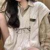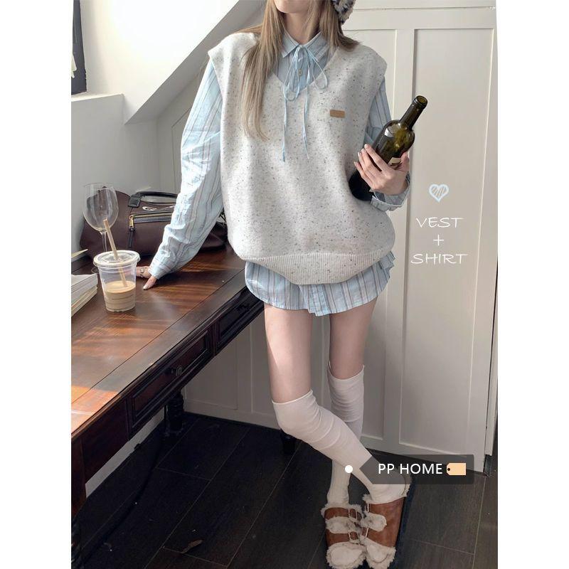 Two-piece set of women's high school era~ college style age-reducing knitted vest stacked sweater vest + striped shirt two-piece set