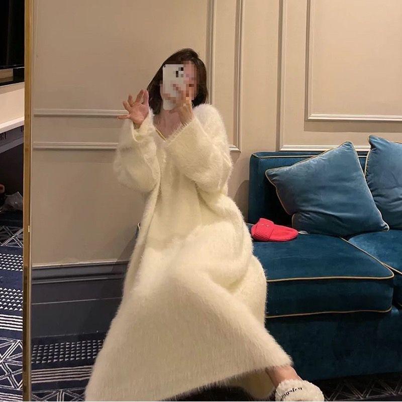 Lazy wind gentle white knee sweater skirt women's winter new 2025 thickened water imitation wool long dress women