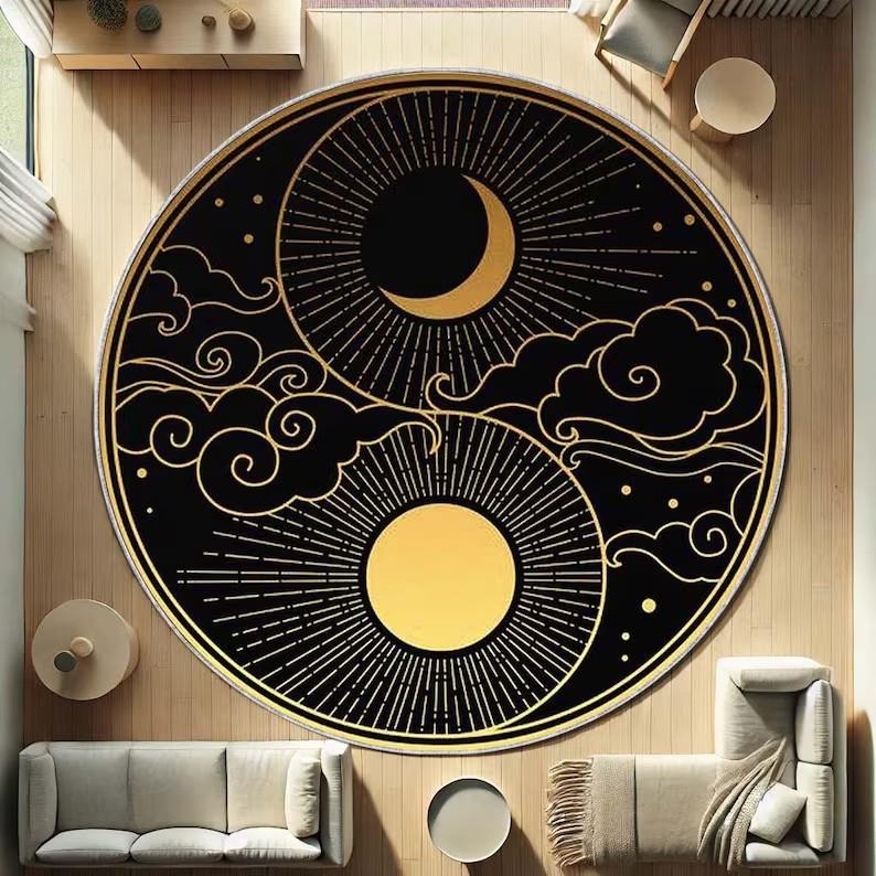 Black and Gold Round Rug Sun and Moon Design Celestial Yin Yang Carpet Boho Mystical Floor Mat Unique Spiritual Home Unique Gift