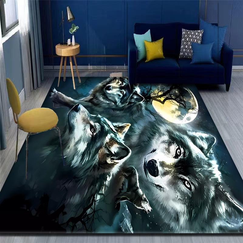 Moonlight Wolf Rug Three Wolves Howling At Full Moon Night Scene Design with Navy Sofa Yellow Chair Modern Home Decor