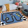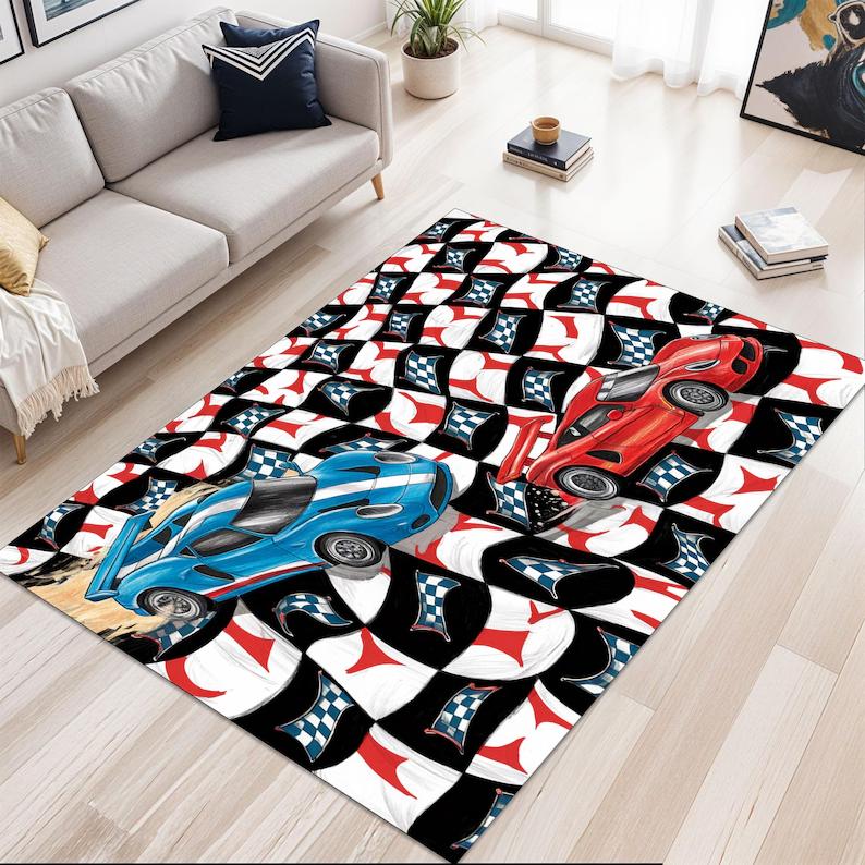 Racing Car Rug with Red Blue Sports Cars Checkered Flag Background Digital Kids Carpet for Boys' Rooms Race Track-Themed Spaces