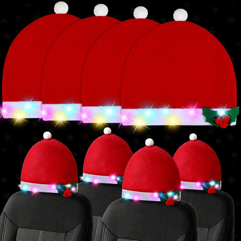 Christmas Car Accessories: you will receive 4 pieces of car headrest covers in Santa hat style, equipped with LED colorful lights, classic and stylish