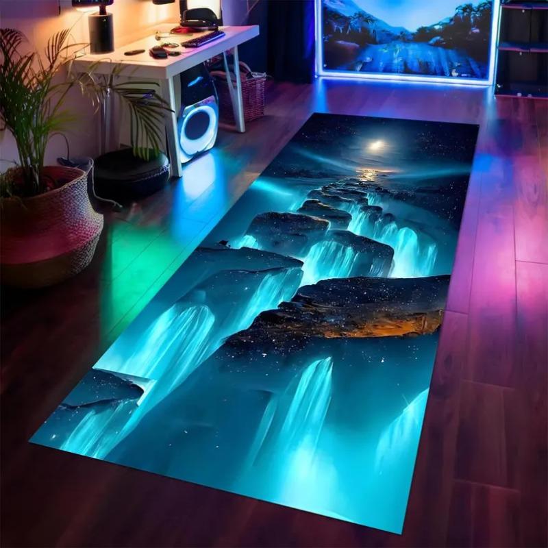 3D Luminescent Waterfall Carpet Glowing Cascade with Rock Cliff Print Runner Rug Ethereal Blue Flow Floor Mat Fashion and Beauty