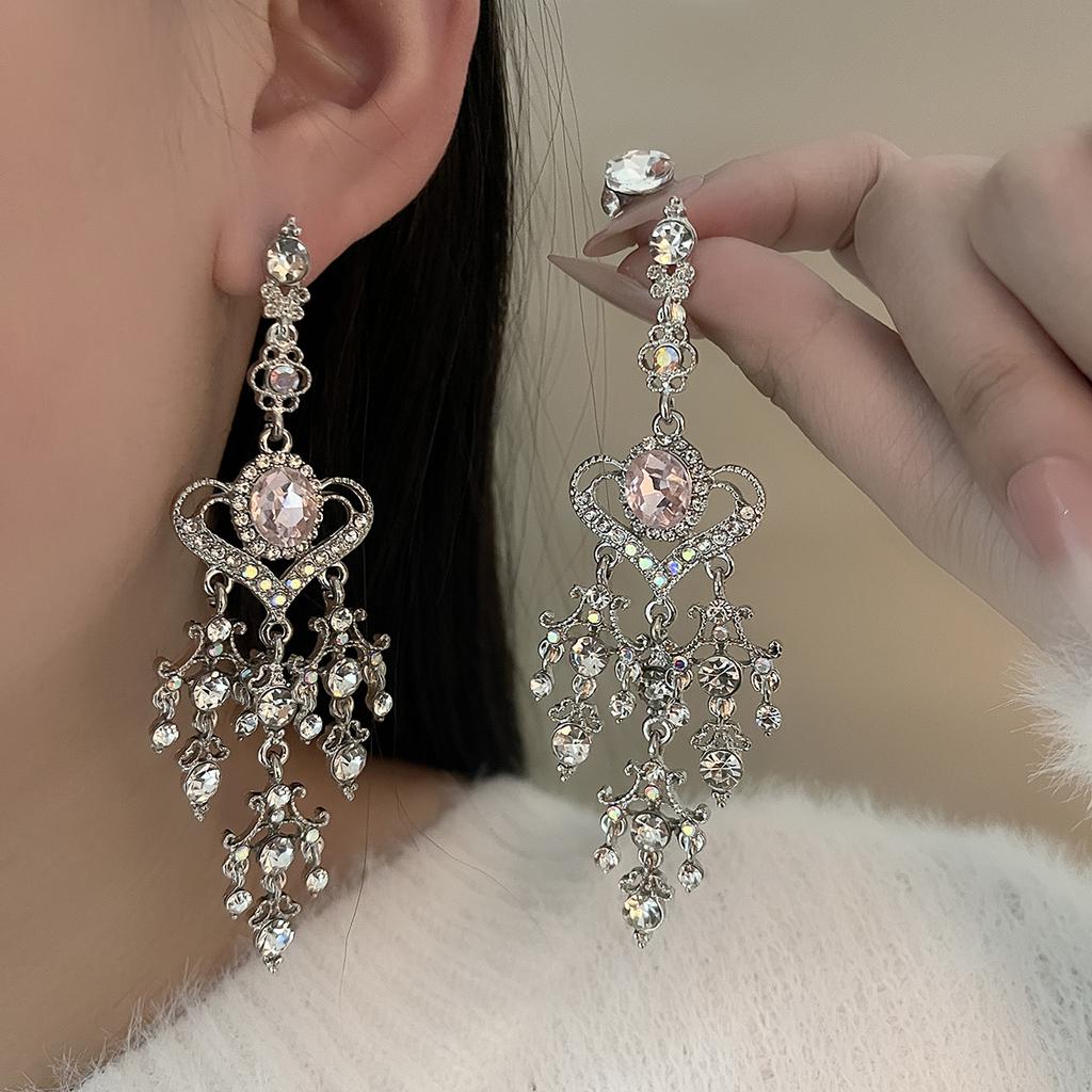 Super Fairy Pink Diamond-Encrusted Love Water Drop Earrings, Retro Baroque Long Sweet Fringed Temperament Earrings