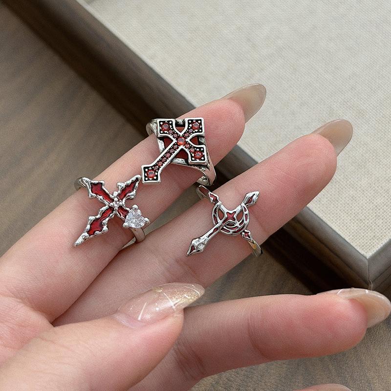 Gothic Spice Girl Red Enamel Zircon Cross Tide Opening Ring Sweet Cool Dark Premium Ring
