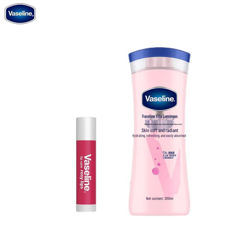 Indulge in a complete skincare routine with this set featuring Vaseline's Healthy Bright Niacinamide Body Lotion for glowing, hydrated, and tender skin, paired with a moisturizing Rose Lip Balm for soft, nourished lips. Suitable for various skin types and offering a light fragrance.
