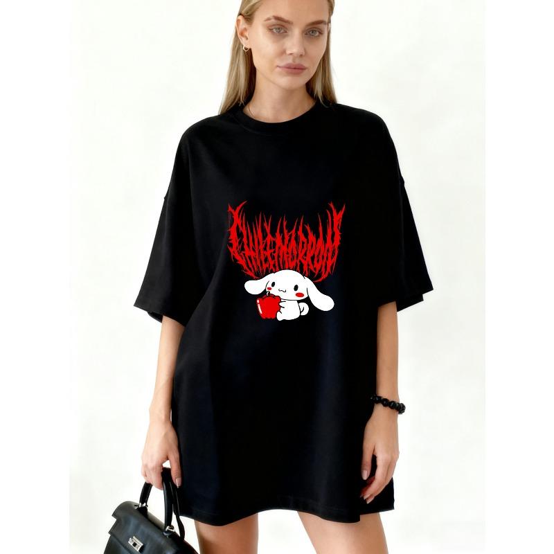 Oversized T Shirt Black Cute Bunny Holding Apple With Red Text Design For Casual Wear