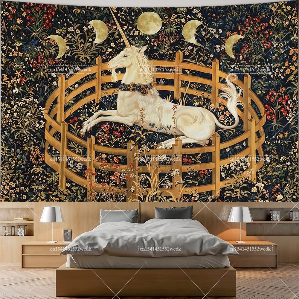 Unicorn In Captivity Medieval Tapestry Celestial Lunar Sun Moon Tarot Tapestrys Wall Art Aesthetic Room Decor Background Cloths