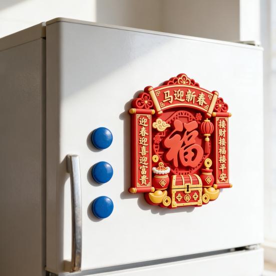 Şenlikli Kırmızı ve Altın Renk Şeması: Uğurlu sembolizmi kucaklayan mıknatısların baskın kırmızı ve altın tonları sıcak bir Yeni Yıl atmosferi uyandırır. Kutsama karakterleri ve atlar gibi kültürel olarak önemli motifleri bünyesinde barındıran bu ürün, ev dekorunuza anında bir kutlama ve iyi şans duygusu getirir.