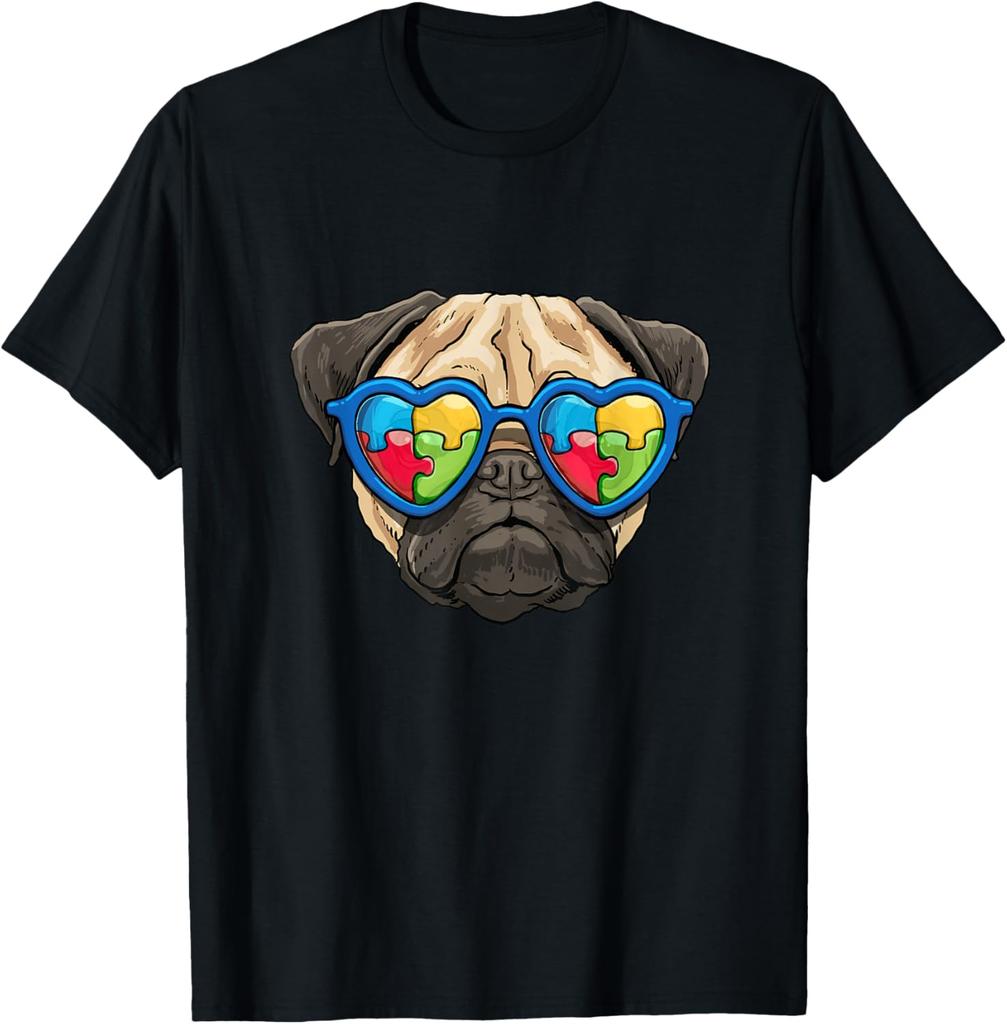 Autism Awareness Pug Dog Heart Puzzle Sunglasses Graphic Tee Casual Cotton T-Shirt for Boys