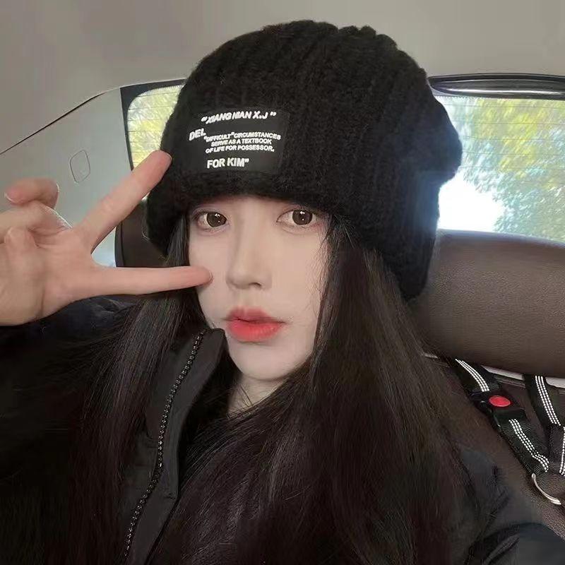 Korean version of alphabet cloth label thickened knitted wool hat women's winter big head circumference pullover hat shows a small face