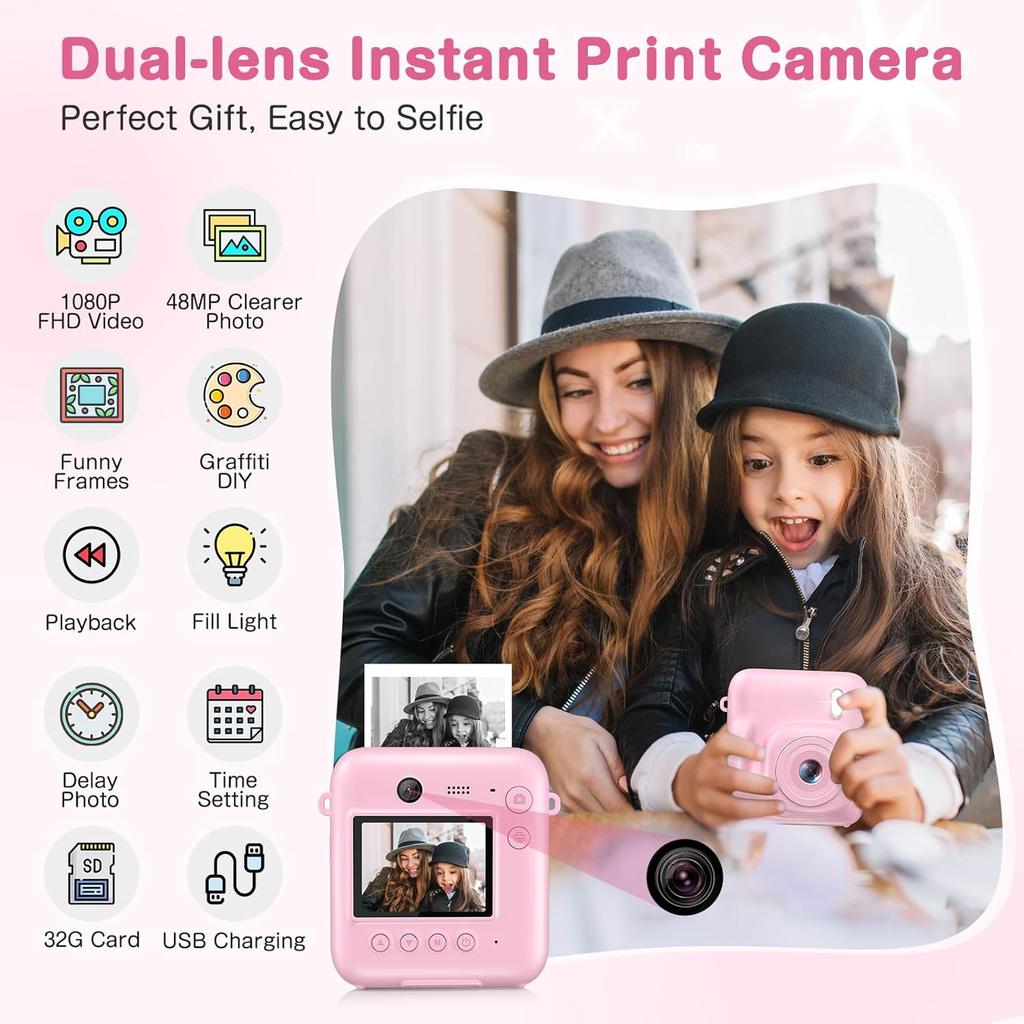 The kids camera has an instant printing function that can print black and white photos in just 1S fast. 32GB card can also store over 2500+ color photos for printing anytime, anywhere