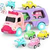 Toys for 1 2 3 Year Old Girl, 5-in-1 Carrier Truck for Toddler Girl, Friction Power Toy Cars with Light & Sound, Birthday Gifts, Pink