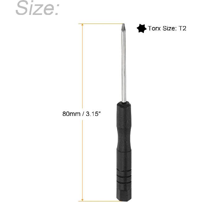Size - T2 torx head, 3.15" (80mm) total length. This screwdriver is a small screwdriver, suitable for handling some small screws, such as those used in electronic products, glasses, watches, etc.