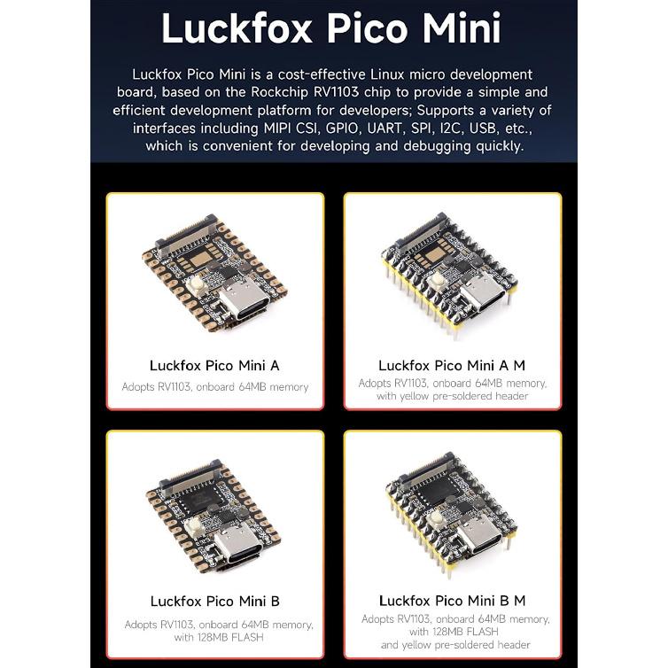 Luckfox Pico Mini RV1103 Linux Micro Development Board with Pre-Soldered Header (without Flash version), based on the Rockchip RV1103 chip, integrates ARM Cortex-A7/RISC-V MCU/NPU/ISP processors, supports a variety of interfaces including MIPI CSI, GPIO, UART, SPI, I2C, USB, etc. which is convenient for developing and debugging quickly