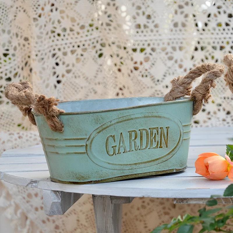 Double Handles Ellipse Iron Flower Pots Retro Style Garden Planting Tool Storage Bucket Florist Home Furnishing Vase Decoration