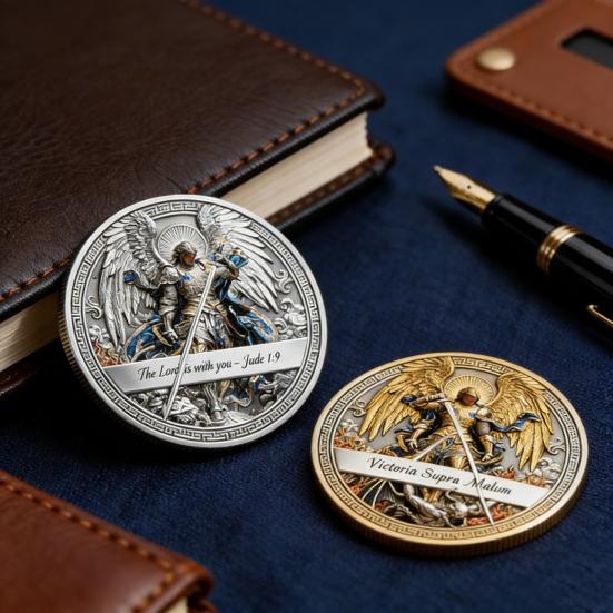 Double-Sided St. Michael Challenge Coin: This coin showcases St. Michael the Archangel on both sides, symbolizing victory over evil and protection. It acts as a guardian angel token that reinforces Christian beliefs and offers spiritual encouragement through its vivid imagery.