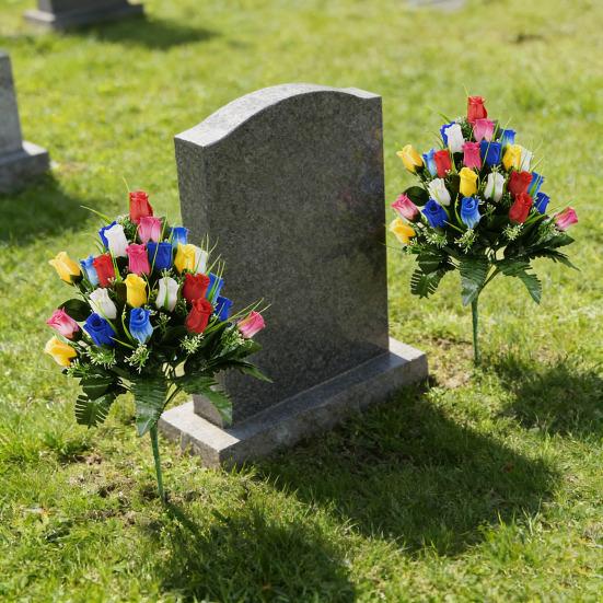 Rich, Solemn Color Palette: The bouquet includes artificial roses in bright yet solemn colors carefully chosen to express memory and respect. Each color carries symbolic meaning—red for longing, white for purity, blue for tranquility, yellow for warmth, and pink for tenderness, perfectly conveying emotions of grief and nostalgia.