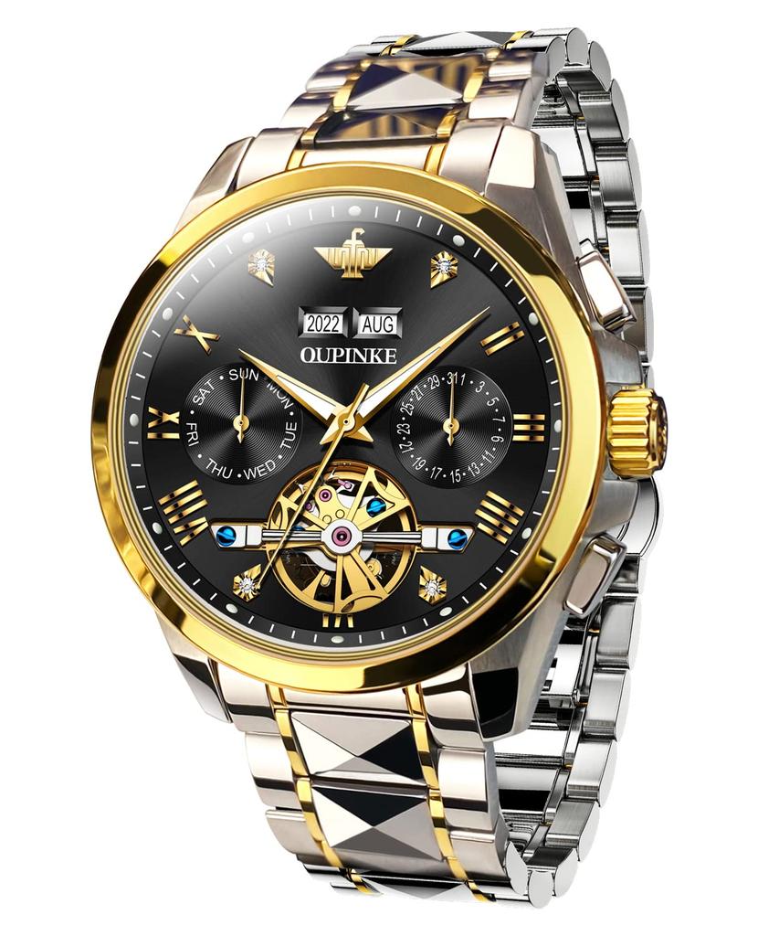 Men's stylish business watch, automatic movement, tungsten tungsten crystal, sapphire crystal, 5 ATM water resistance, calendar function, luminous