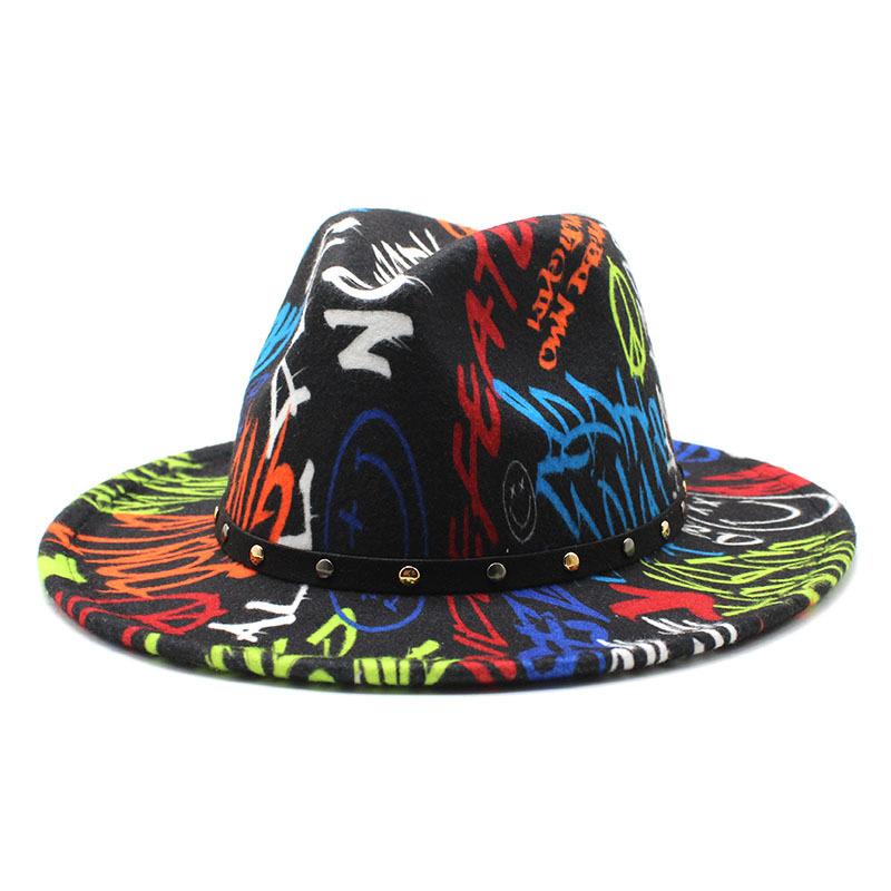 2021 Graffiti Print Big Brim Woolen Felt Hat Men'S And Women'S Top Hats Jazz Hat Felt Hat