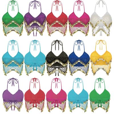 Kadın Pullu Kırpılmış Üst Göbek Dansı Sütyen Üstü Madeni Para Askılı Tank Üstü Kostüm Pullu Püsküllü Üst