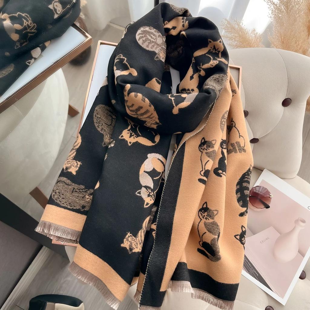 Latest Animal Jacquard Kitty Scarf Imitation Cashmere Soft Warm Fringe Shawl Autumn Winter Coldproof Windproof Blanket Scarf