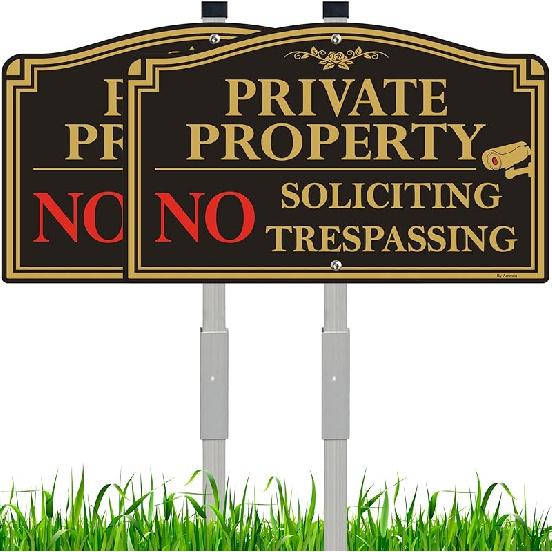 Private Property No Trespassing Sign, 12" x 8" No Soliciting Sign Aluminum with 28" Tall Alloy Stake for Easy Installation, Rust-Free& Fade Resistant
