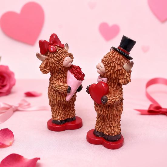 Celebrate love with this charming highland cow ornament set, perfect for Valentine's Day decorations. Featuring a pair of resin statuesshe holds a red rose, he holds a red heartthese figurines symbolize affection and sweetness, making them ideal romantic gifts or festive home accents.