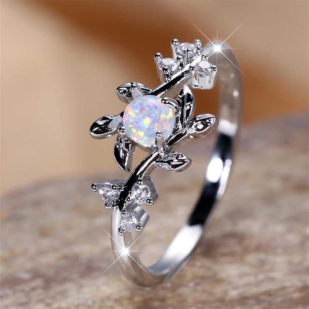 Small Round Stone White Opal Tree Branches Leaf Thin Rings For Women Vintage Silver Color Wedding Bands Birthstone Jewelry Gifts