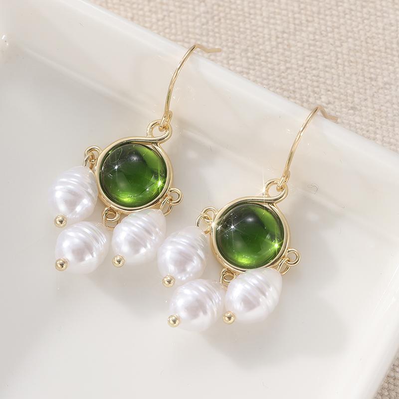 Retro Elegant Imitation Pearl Synthetic Emerald Pendant Earrings for Women Exquiaite Gorgeous Banquet Jewelry Accessories Crafts