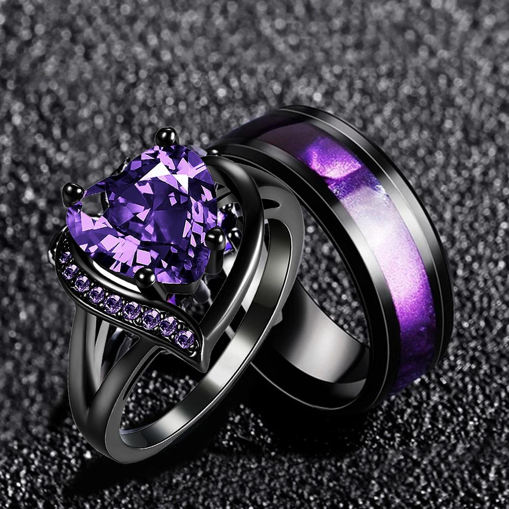 Couple Rings Romantic Women Heart Purple Rhinestones Zircon Ring Trendy Men Stainless Steel Rings Wedding Band JewelryWelcome to my shop !!!