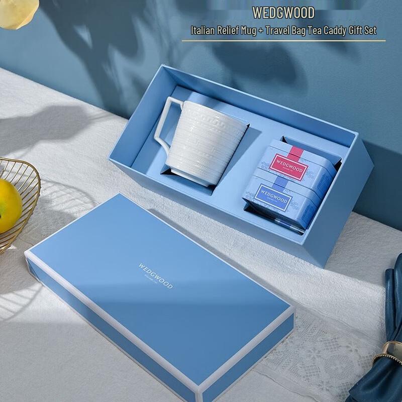 Experience elegance with this Wedgwood bone china gift set, featuring an Italian relief-designed mug and a convenient portable tea caddy. Perfect for enhancing your tea moments at home or in the workplace.