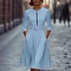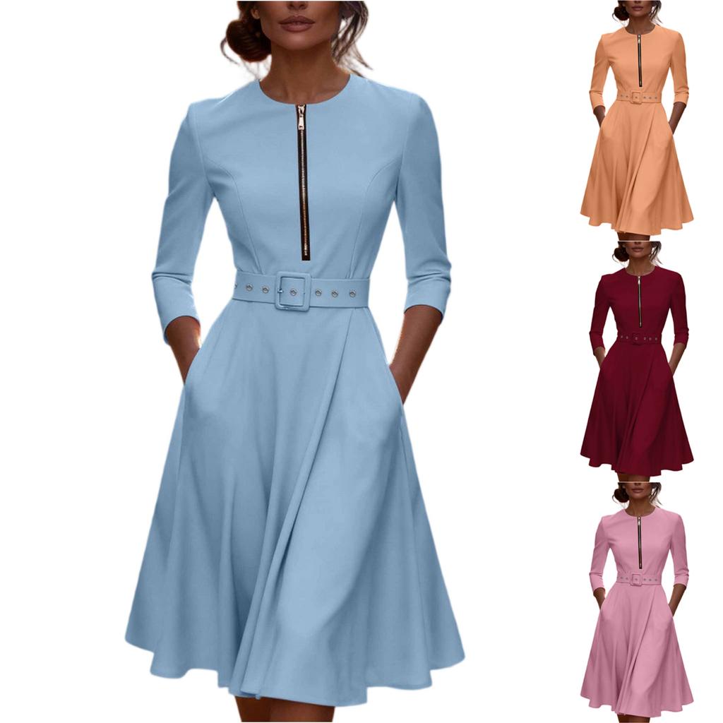 Women's Fashionable Round Neck Seven Quarter Sleeve Zipper Pocket Casual Dress With Belt
