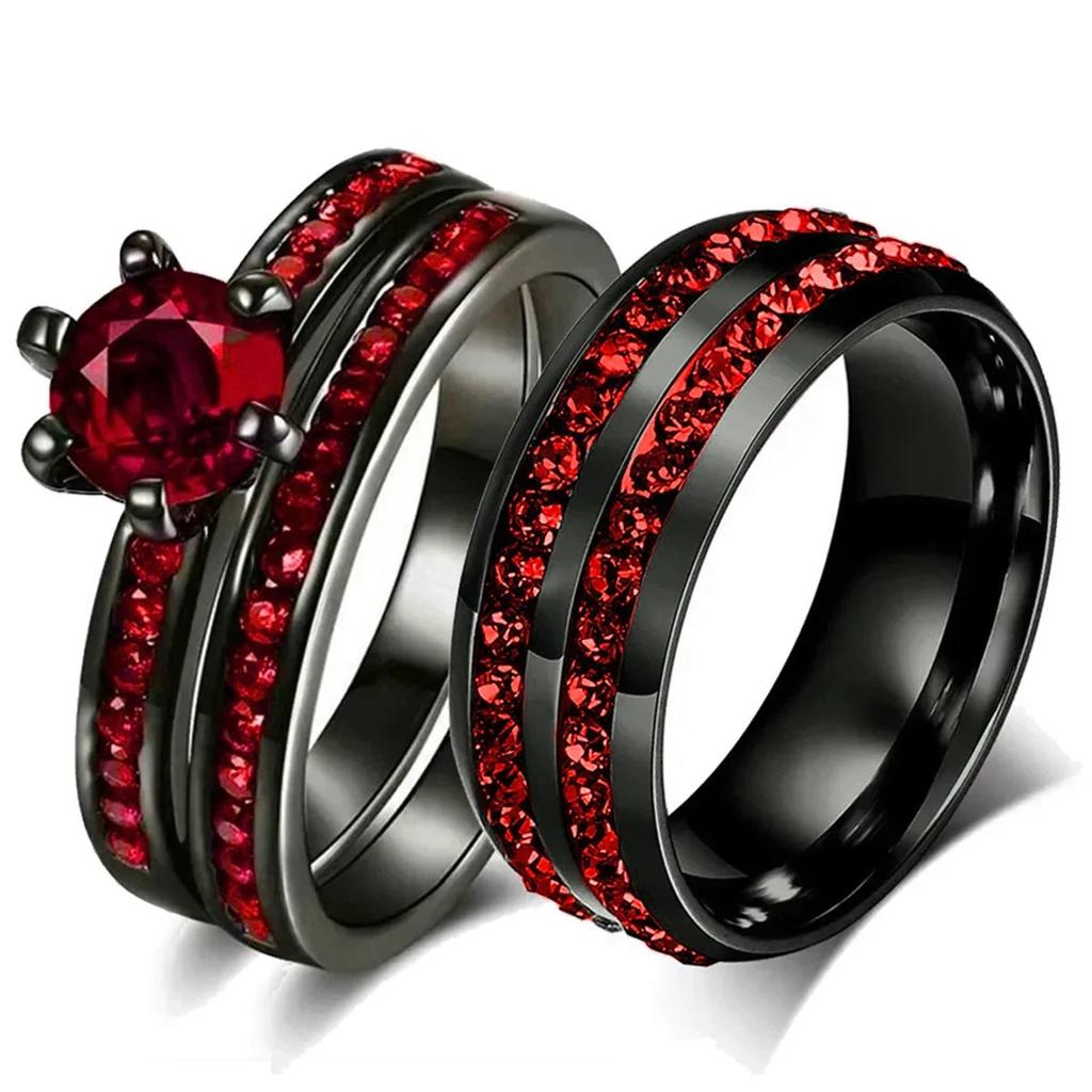 Fashion Couple Rings Romantic Red Rhinestones CZ Women Rings Set Trendy Men Stainless Steel Zirconia Ring Wedding Band